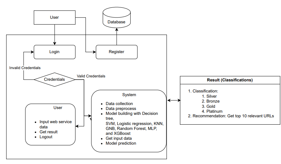 The "Web Service Classification and Recommendation" project aims to enhance the process of selecting and recommending web services using machine learning techniques. The project is divided into two primary components: Classification Model: This model classifies web services into quality categories—Bronze, Silver, Gold, and Platinum—based on key Quality of Service (QoS) attributes like response time, availability, reliability, and throughput. The model is built using several machine learning algorithms, including Decision Trees, Support Vector Machines (SVM), Logistic Regression, K-Nearest Neighbors (KNN), Naive Bayes, Random Forest, Multi-Layer Perceptrons (MLP), and XGBoost. Additionally, Explainable AI (LIME) is employed to provide transparency and interpretability in the classification decisions, allowing users to understand why a web service falls into a particular quality category. Recommendation Model: Using the K-Nearest Neighbors (KNN) algorithm, this model recommends the top 10 most relevant web services based on user-inputted QoS attributes. It computes the similarity between the input data and existing web services to provide tailored recommendations. The system's user-friendly interface allows users to upload web service data, view classification results, and receive personalized recommendations. The project provides an efficient and scalable solution for selecting high-quality web services, enabling users to make data-driven decisions based on performance metrics. With its dual approach—classification and recommendation—this system improves decision-making, enhances user experience, and supports businesses in optimizing service selection.