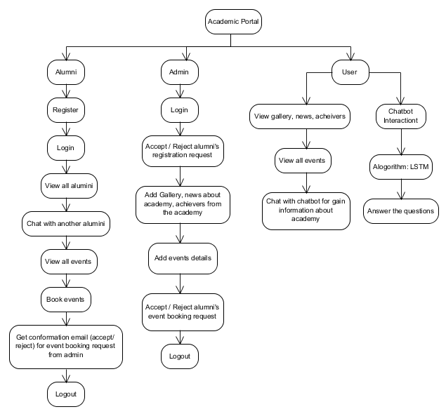 Keywords: Alumni Network, Admin, User, Chabot, Chat box, Academy.