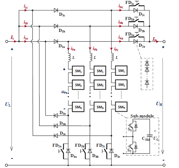 Currently, outstanding development has been made inside the voltage supply converter (VSC) based high voltage direct currnt (HVDC) transmissions. For the approaching requirement to interconnect multiple DC transmission lines with specific voltage levels, high voltage and huge energy DC/DC converters are important. The project researches a non-remoted bidirectional DC/DC converter which consists through cascaded half of-bridge SMs, series connected diodes, and mechanical disconnectors. This hybrid topology affords very attractive features together with low value, excessive efficiency, and light weight. Operation precept, parameter design, and devoted manage strategies are evolved. Simulation of a 150MW, 200kV/300kV DC/DC converter has been finished to verify its overall performance and compare the efficiency. The simulation results in addition affirm the effectiveness of the proposed DC/DC converter.