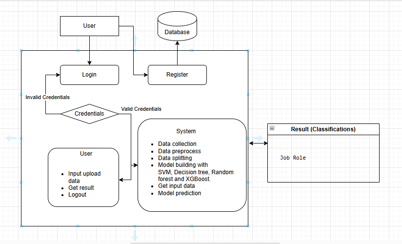 The project utilizes existing machine learning algorithms such as Support Vector Machine (SVM) and Decision Tree for initial predictions, while proposing enhanced models like Random Forest and XGBoost for improved accuracy and performance. The system's input includes a range of subjects and skills, such as Database Fundamentals, Cyber Security, AI/ML, Data Science, and Graphics Designing, among others. These input parameters serve as the foundation for predicting the most suitable Job Role for the user.