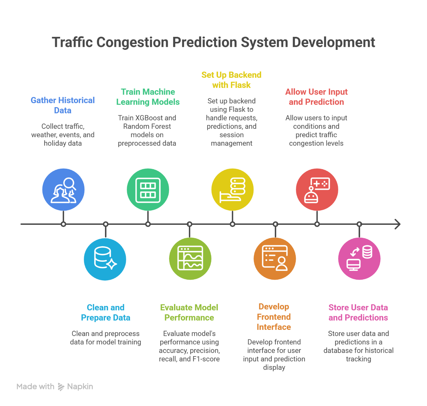 This project focuses on predicting traffic congestion levels using machine learning models based on temporal, weather, and event-based features. By leveraging data on factors such as time of day, weather conditions (temperature, humidity, wind speed), local events, and holidays, the system aims to classify traffic conditions as "HIGH", "MEDIUM", or "LOW". The project utilizes algorithms such as XGBoost and Random Forest for accurate predictions and stores the results in a database for easy access. The system offers a user-friendly interface where predictions can be made through a web-based application. This tool provides valuable insights for urban planning, traffic management, and route optimization, ultimately contributing to better transportation systems.